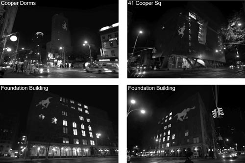 The request is for a small crew of 4 people to set up the projector, operate it and videotape it for documentation; set up starting at 8pm and breaking down at midnight. I do not need an audience area, though if audience were allowed to view the projector operations that would be preferable. I would also request use of electricity so I don’t have to set up a generator, though I have such ready, if needed.