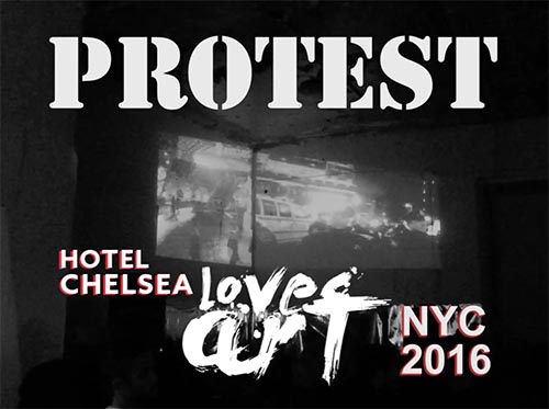 Protest BLM @ Hotel Chelsea Loves Art (2016), is a 2 channel video installation with audio, depicting the protesting of the Eric Garner killing. It splits the documentation into two streams, presented on either side of a corner, with the protestors on one side and the police on the other, coninually facing off with each other in a 15 minute loop.