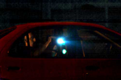 iron fence, topped with razor wire. The car made