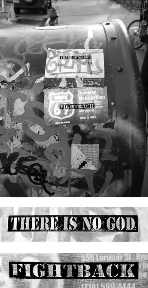 the 2 stamps in use read "There is no god" and "Fightback".