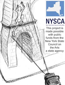 Funded in 2009 by the New York State Council on the Arts, production of a new VRAG was completed in early 2010, along with final versions of the animations. With extensive location scouting and planning, with insurance purchased, dates fixed, crew booked and all requirements met, permits were requested from the Mayor’s Office of Film, Theatre and Broadcasting, NYC. After much debate, conferencing with lawyers in City Hall and attempts to find a way to do it, the MOFTB finally declined to issue permits for any of the locations requested, stating that they are not allowed to issue permits for projections on any city property. |