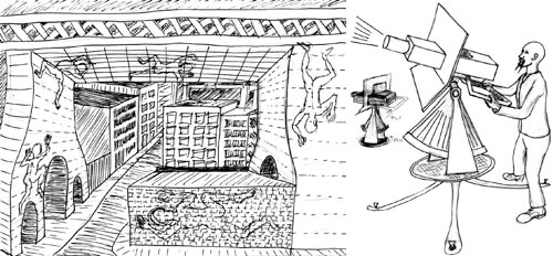 The performer operates the projector by pointing it to the target and roving the structure with images. He has an array of buttons along the projector handles that allow him to change/edit/mix the video content. He plays the projector like a musical instrument, hitting different surfaces with different clips and endless combinations of clips.
