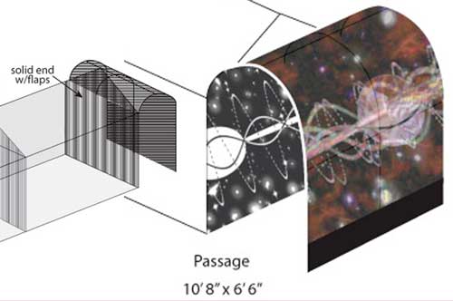 Inside the passageway, participants press a red button on a podium to start the sequence. Standing in front of the podium, they are surrounded by animated video images and sounds. |
